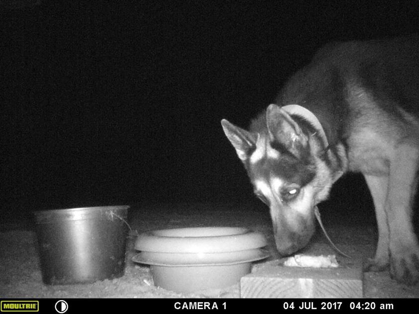 When I got about twenty feet from the trap I switched on my flashlight and was astonished to see Paco for the first time! He was also astonished, or more accurately scared, and started barking at me right away.