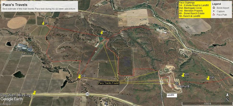It was getting late, but I chose to call the brother of Paco's owner, largely because he lives in Paso Robles and Paco's owner lives an hour or more away. It was clear from the tone of his voice that there was a bit of disbelief that I was with Paco, who had been trapped at the landfill . I had not shared the events of the past few days, not wanting to botch the one good opportunity to capture Paco.